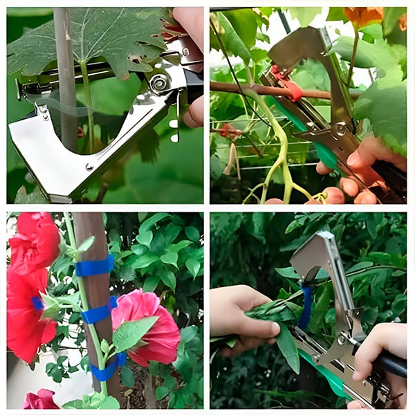 Rihma tangide vahel venitamiseks vajutage lihtsalt käepidet. Seejärel mähitakse teip ümber taime, mida soovite siduda. Teibi pingutamiseks ja lõikamiseks vajutage käepidet uuesti. Väga lihtne! – ärge muretsege oma taimede kahjustamise või neile valu tekitamise pärast, kuna teip ja klammerdaja tagavad õrna, kuid kindla haarde.